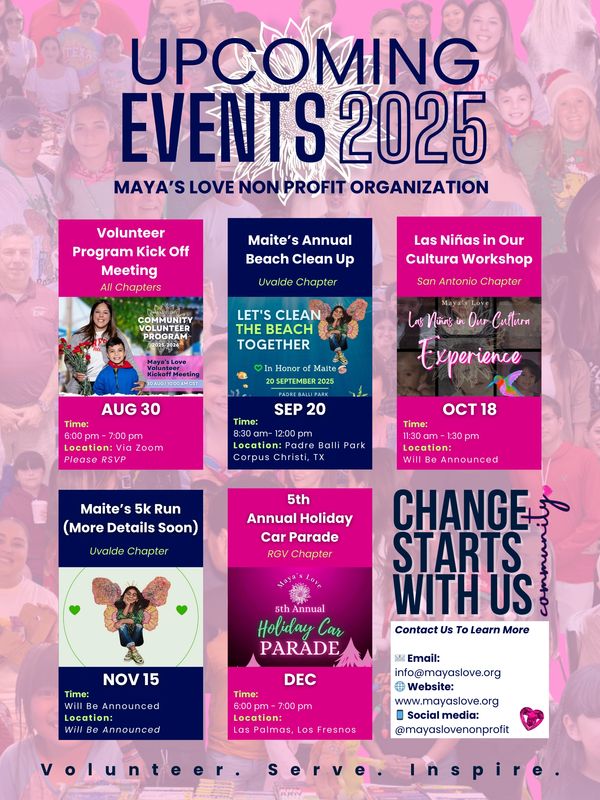 From August to December, Maya’s Love is bringing our community together for volunteer projects, cultural celebrations, and acts of service that inspire hope and change.